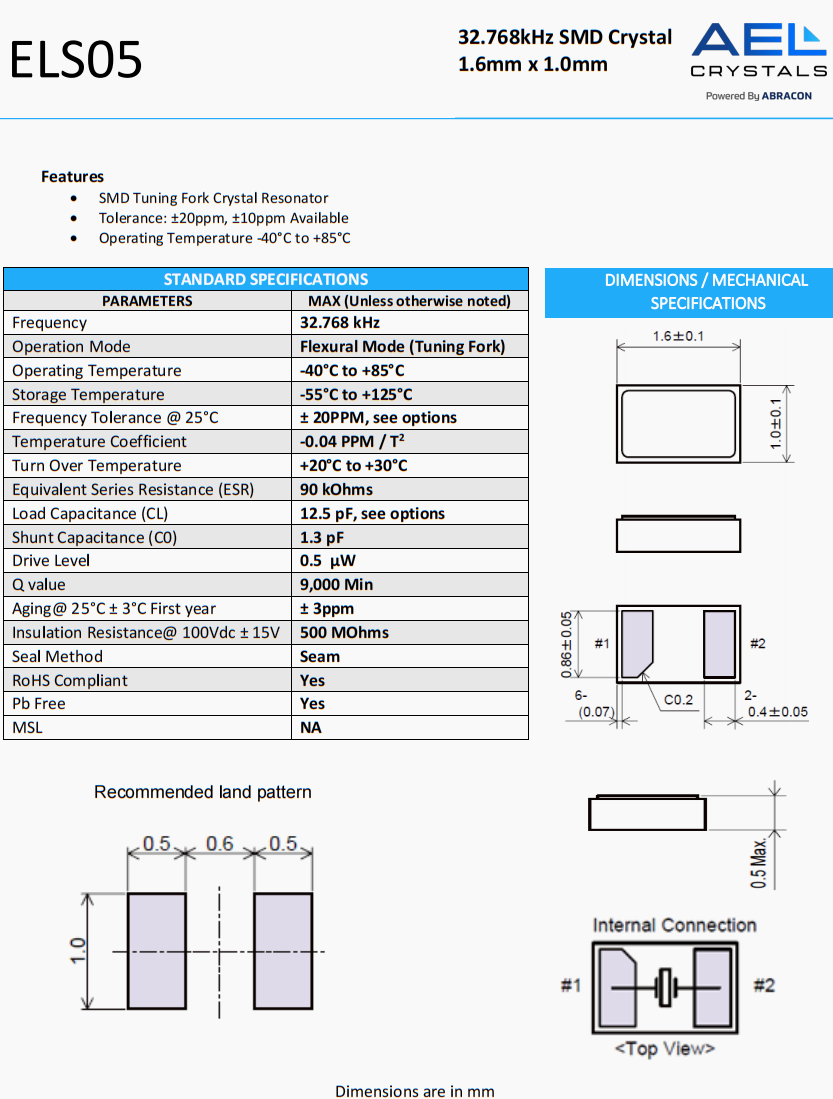 ELS05-32.768kHz-9-T | AEL Crystals | ELS05 | 32.768 kHz | ±20ppm | 9 pF | |