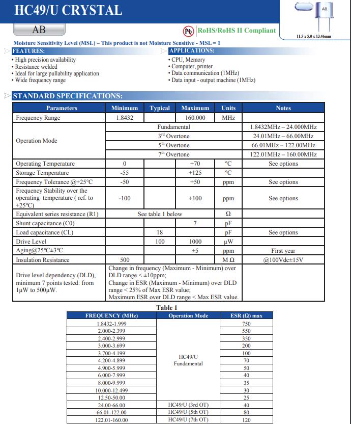 AB-1.8432MHZ-B2 | Abracon晶振 | AB | 1.8432MHz | ±100ppm | ±20ppm | 18pF |
