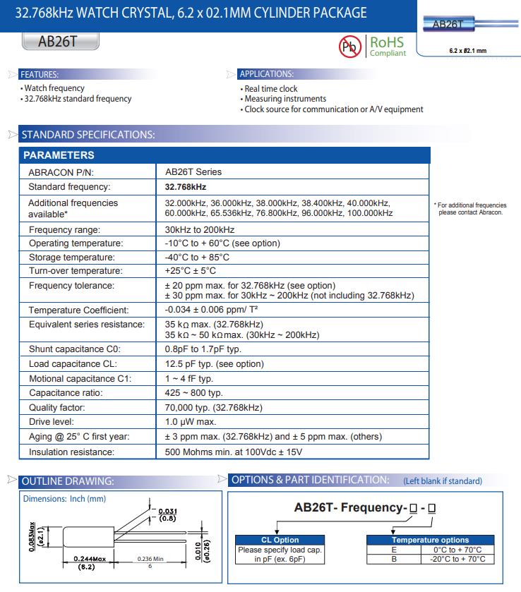 AB26T-32.768KHZ | Abracon晶振 | AB26T | 32.768kHz | ±20ppm | 12.5pF | -10°C ~ 60°C |