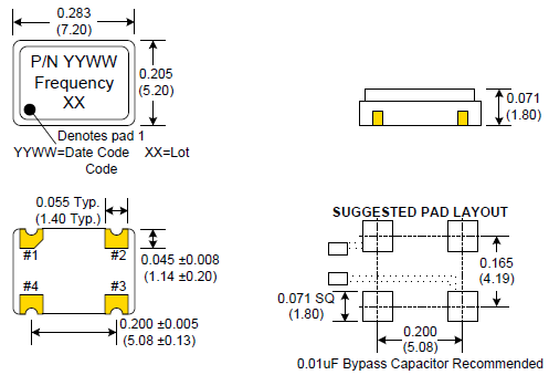 Crystek瑞斯克C3290晶振,C3290-14.318180時鐘振蕩器,C3290-16.000,7050mm晶振,尺寸圖