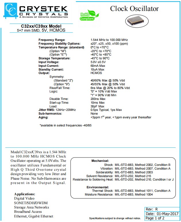 Crystek瑞斯克C3290晶振,C3290-14.318180時鐘振蕩器,C3290-16.000,7050mm晶振,參數圖