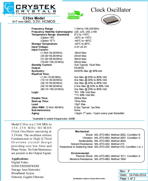 C3390-16.000 | Crystek Crystal | C33 | XO (Standard) | 16MHz |
