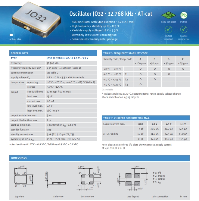 O20,0-JO32-B-3,3-2-T1-LF,3225有源四腳晶振,JAUCH晶振