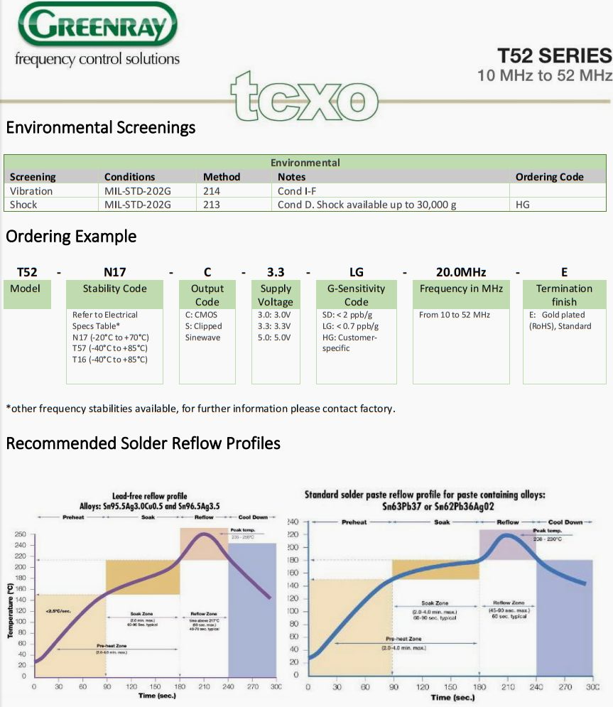 Greenray晶振,溫補6G信號發射器晶振,T52-N17-C-3.3-LG-28.0MHz-E八腳晶振,美國格林雷晶振公司,歐美晶振,石英晶振,貼片晶振,有源晶振,TCXO晶振,八腳晶振,高精度晶振,進口晶振,6G無線通信晶振,Greenray Industries的T52系列TCXO已開發為參考振蕩器,用于要求低噪聲,低功耗,緊密穩定性,溫度和緊湊占地的定時應用。特點:小巧堅固的5.0 x 3.2 mm封裝,可承受高達30,000 g的振動和高沖擊,在- 20至+70°C范圍內的溫度穩定性為±0.1 ppm, 10年以上的長期老化< 5 ppm,低加速度靈敏度< 0.7 ppb/g,低功耗,低至2mA,實現可靠的電池供電性能增益。低相位噪聲,應用。采購產品電信,高沖擊電子,移動無線電,移動儀器,機載通信,無線通信,微波接收器