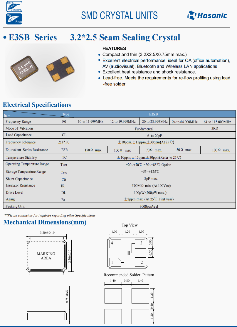 E3SB32E00001ME_ | Hosonic晶振 | E3SB | 32 MHz | ±15ppm | ±20ppm | 9pF | -20°C ~ 70°C |