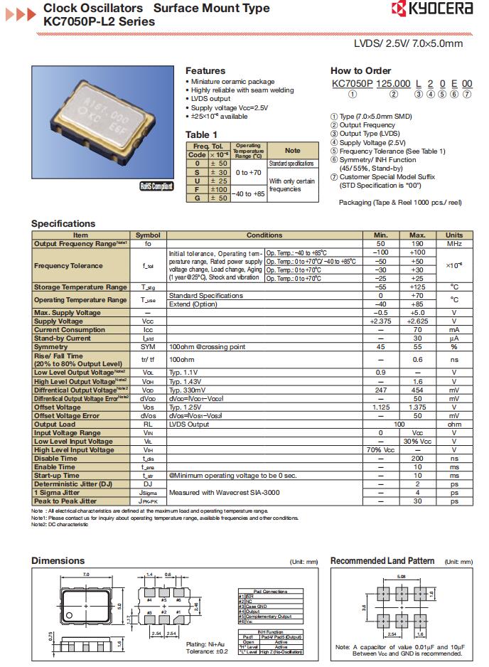 KC7050Y125.000P20EZU | AVX Corp/Kyocera Corp | KC7050Y-P20EZU | 125MHz | 2.5V | 0°C ~ 70°C |