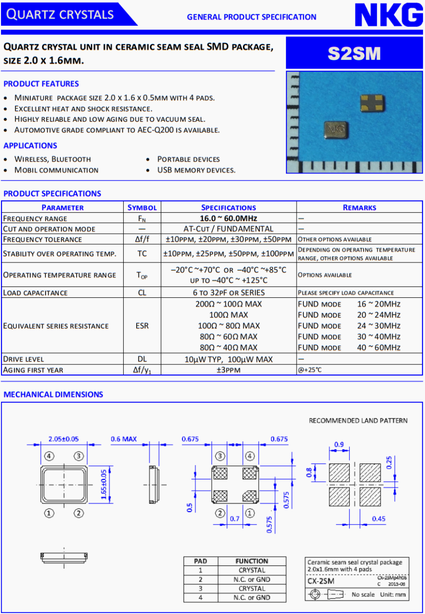 NKG超小型晶體,胎壓監測裝置晶振,S2SM24.5760F12MYY-EXT貼片晶振,NKG晶振公司,無源晶振,貼片晶振,超小型晶振,2520晶振,液晶儀表盤晶振,石英晶振,耐高溫晶振,汽車多媒體設備晶振,6G通訊設備晶振,6G網絡終端晶振,無源晶振,貼片晶振。石英晶體單元在陶瓷縫密封SMD封裝,尺寸25. x 2.0mm。產品特點:微型包裝尺寸2.5 x 2.0 x 0.5mm,有4個襯墊。優異的耐熱性和抗震性。真空密封,可靠性高,老化率低。符合AEC-Q200標準的汽車級產品可供選擇。應用范圍:無線、藍牙、移動通訊、便攜設備、USB存儲設備