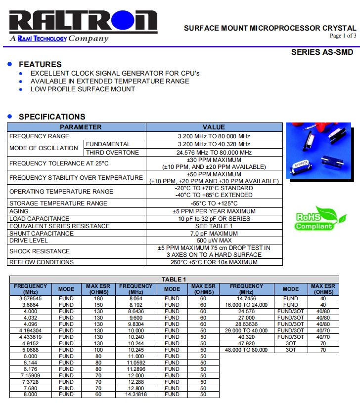 AS-18.432-18-SMD-TR | AS-SMD | 18.432MHz | 13.50 x 4.80mm | ± 30 ppm | ± 50 ppm | 18 pF |