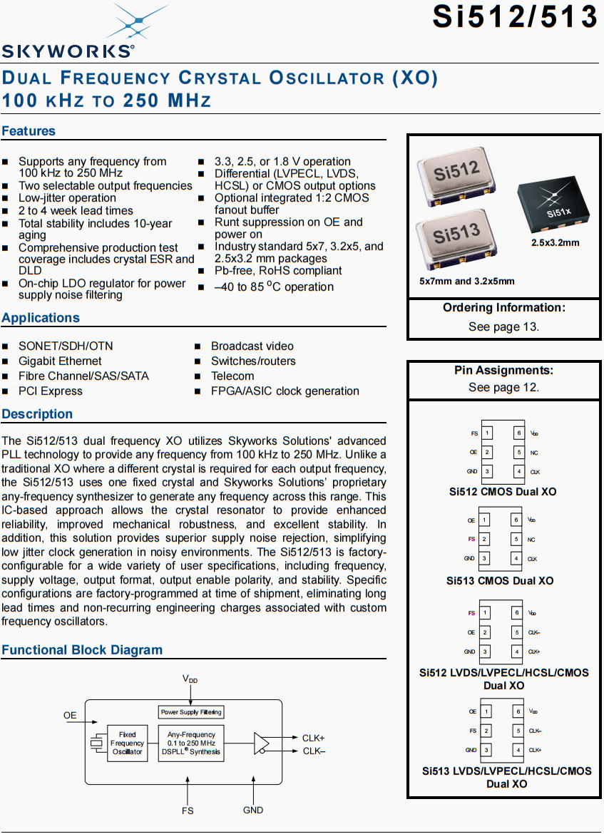513BBA200M000AAG | Skyworks晶振 | Si513 | XO | 200 MHz | LVDS | 3.3V | ±25ppm |