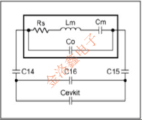 如果使用設計為使用不同負載電容振蕩的晶體,則晶體被拉離其規定的工作頻率,從而在參考頻率中引入誤差.因此,為了將晶體拉回到所需的工作頻率,需要添加外部電容來修改負載電容.圖3顯示了MAX1470EVKit電路中的晶振.在該電路中,C14和C15是串聯牽引電容器,而C16是并聯牽引電容器.Cevkit與MAX1470等效,加上evkitPCB雜散電容.Cevkit大約是5pF.