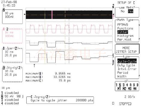 工程師可以使用Jitter Track逐周期測量系統時鐘來驗證系統時鐘是否符合此規格.如圖3所示.在100us記錄中,最大周期與周期周期之差為70ps.可直接從Jitter Track周期讀取該值,以在軌跡C中循環波形.垂直參數光標之間的區域標記為最大值.跡線A是所采集數據的縮放擴展,顯示了兩個具有最大差異的相鄰周期.跡線B是Jitter Track周期,它讀取時鐘波形每個周期的絕對周期.