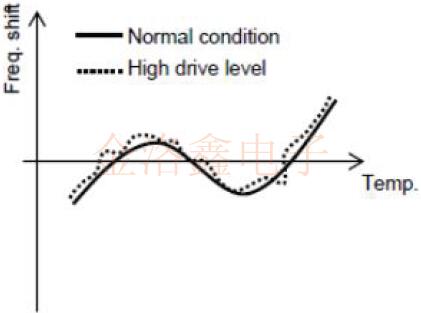 如果驅動電平超過村田諧振器單元規格中的指定值,則可以確認振蕩頻率異常的溫度特性.它稱為”浸入”或”活動浸入”.驅動器級別過高時可能會發生這種現象.如下圖所示,AT切割晶體的溫度特性通常是平滑的三階曲線.如果有活動性下降,則振蕩頻率的溫度特性會失真.為避免發生活動下降,必須降低驅動器級別.