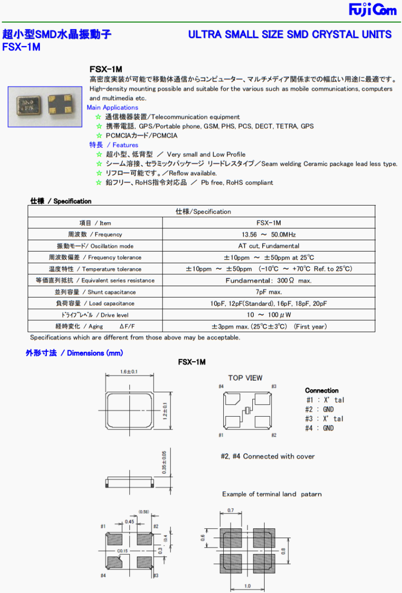 FCX1M04800012E3J | Fuji晶振 | FCX-1M | 48 MHz | ±30ppm | ±20ppm | 12pF | -20°C ~ 70°C |