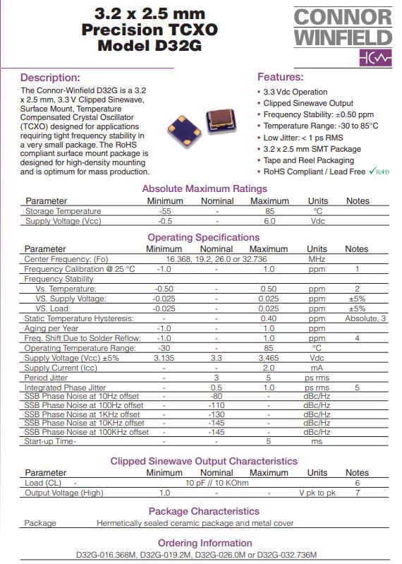 SPXO振蕩器特點: 3.3Vdc操作 削波正弦波輸出,頻率穩定性:0.50ppm,溫度范圍:-30至85攝氏度,低抖動:<1psRMS,3.2 x 2.5毫米SMT封裝,帶卷包裝,符合RoHS標準/無鉛.ConnorWinfield溫補晶振為苛刻數據通信開辟新天地D32G-019.2M.