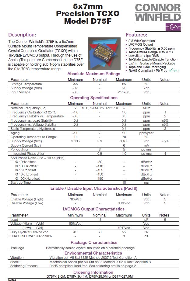 康納溫菲爾德利用自身獨(dú)特的優(yōu)勢(shì),開(kāi)發(fā)性價(jià)比超高的有源晶振編碼D75F-027.0M,型號(hào)D75F,頻率為27MHZ,D75F是一個(gè)5x7mm的表面安裝溫度補(bǔ)償晶體三態(tài)可控振蕩器(TCXO溫補(bǔ)晶振)LVCMOS輸出。通過(guò)模擬的使用溫度補(bǔ)償,D75F是有能力在0至70°C范圍內(nèi)保持低于1ppm的穩(wěn)定性溫度范圍內(nèi)。