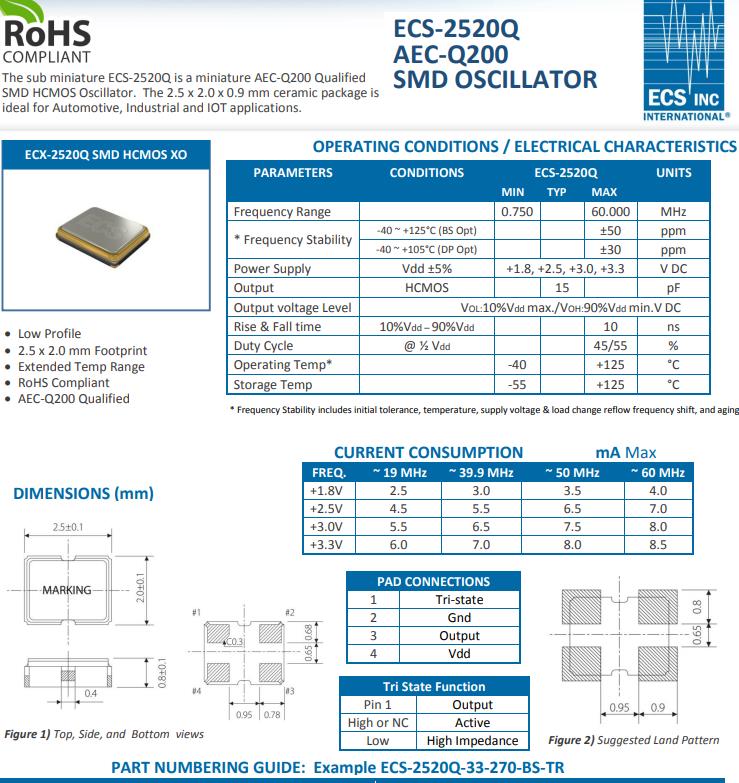 The sub miniature ECS-2520Q is a miniature AEC-Q200 Qualified SMD HCMOS Oscillator. The 2.5 x 2.0 x 0.9 mm ceramic package is ideal for Automotive, Industrial and IOT applications.