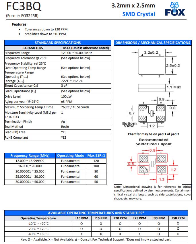 FQ3225BR-12.000 | FOX晶振 | FQ3225B | MHz Crystal | 12MHz | ±50ppm |