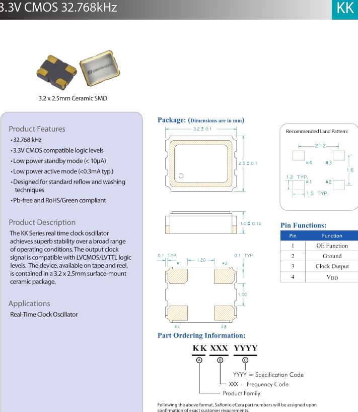 KK3270051 | Diodes晶振 | SaRonix-eCera™ KK | 32.768kHz | ±25ppm | -40°C ~ 85°C |