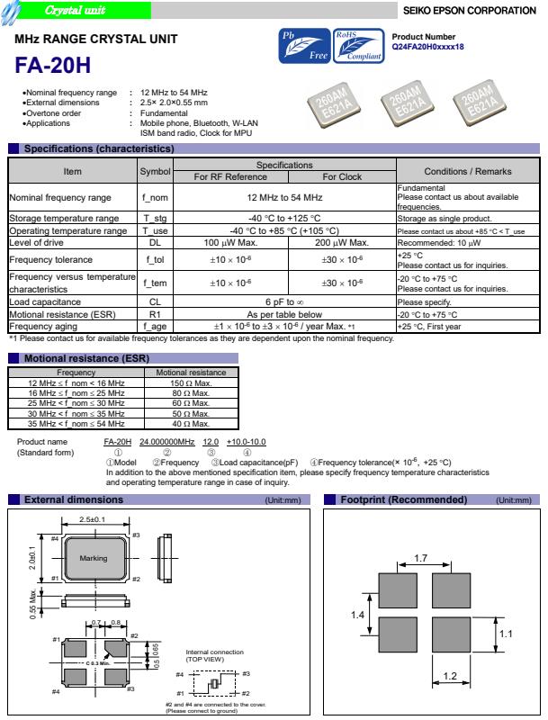 Q24FA20H0070600 | 2.5 x 2 x 0.55mm | FA-20H | 20.000000 MHz | 9 pF | +/-10 ppm | +/-12 ppm |
