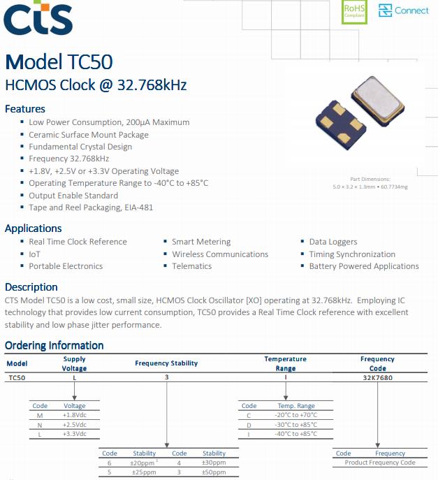 TC50L5I32K7680 | CTS晶振 | TC50 | 32.768kHz | ±25ppm | 0.197" L x 0.126" W (5.00mm x 3.20mm) |
