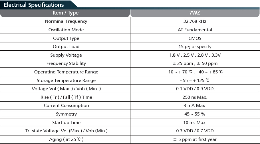 7XZ晶振是最為常用的3225尺寸封裝貼片石英晶振,參數如下: