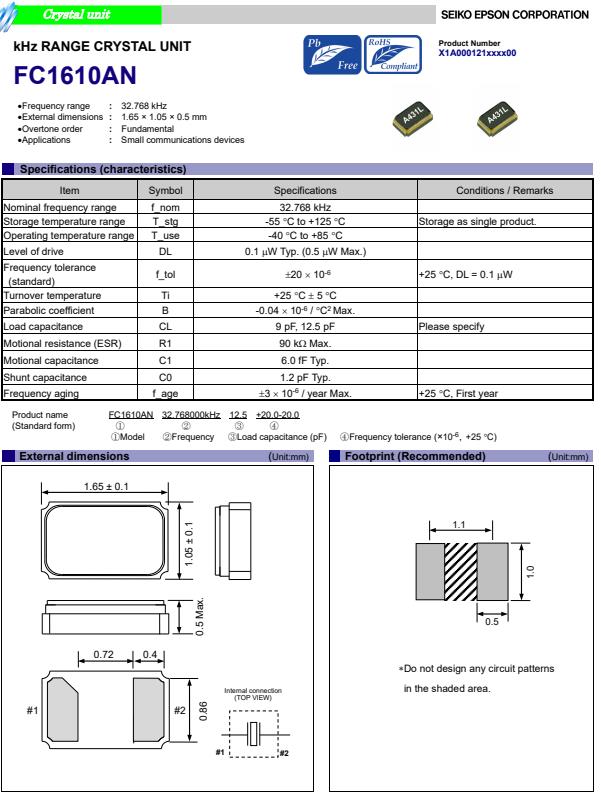 X1A000121000700 | 1.65 x 1.05 x 0.5 mm | FC1610AN | 32.768kHz | 15 pF | +/-20.0 ppm | -40 to +85 °C |