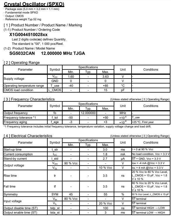 X1G004451002800 | SG5032CAN | 12.000000 MHz | 5.00 x 3.20 x 1.10 mm | CMOS | 1.620 to 3.630 V | -40 to 85 °C | +/-50 ppm |