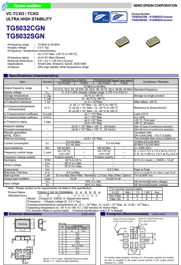 X1G005231001700 | TG5032CGN | 10.000000 MHz | 5.00 x 3.20 x 1.45 mm | CMOS | 3.135 to 3.465 V | +/-1.0 ppm | -40 to ++85 °C |