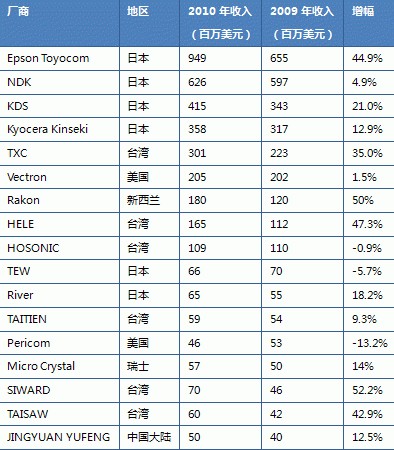 然而在大陸地區,還是不免還是有諸多愛國人士,會選用臺產晶振,比如(HOSONIC)鴻星晶振,其實此款晶振不比以上幾款晶振的差,差別只是沒以上幾款晶振的名聲響而已。以下是2010年時各大晶振廠家的收入排名,就可以看出鴻星晶振在海內外的火熱程度。