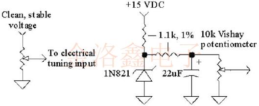 作為一種選擇,可以將振蕩器的內部參考電壓引致一個引腳上,以連接到多圈電位計以進行微調.或者,可以將來自單獨電源的干凈DC施加到電調諧銷上.如果可用電源有噪聲或不穩定,則可能需要添加一個齊納二極管或參考設備以及一個低通噪聲濾波器.溫度補償齊納二極管(如1N821)是提供良好溫度穩定性和極低噪聲的絕佳選擇(在大多數情況下),以下所示的22uF濾波電容器可省去.參考設備具有出色的穩定性,但它們通常具有相當高的噪聲電壓,因此建議進行額外的濾波器. 這里有幾點要考慮: