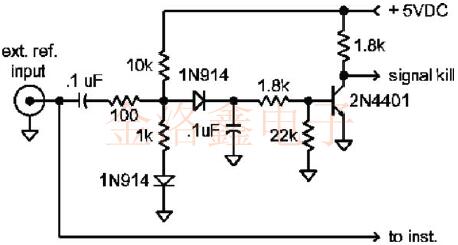 信號殺死輸入通常接受普通的TTL電平,但可以輕松配置為自定義開關電平.大多數信號殺死輸入均設計為在末連接時浮動至"開"狀態,內部RC電路可保護晶振免受可能存在于控制線上有有害電壓或干擾RF信號的侵害.下面顯示的電路將檢測到存在大于1伏pp的外部基準,并產生適合驅動大多數信號殺死輸入的邏輯"低".該控制信號還可用于門控儀器電路的外部輸入.該電路設計為表現出相當高的輸入阻抗,因此在儀器的其他位置假設電纜端接正確. 如果期望內部振蕩器具有比外部基準更好的短期穩定性,則可能需要將內部振蕩器相位鎖定到基準.鎖定的振蕩器將表現出內部晶體振蕩器的良好短期穩定性和外部基準的良好長期穩定性.一個簡單的一階環路可以由三態總線設備或模擬開關以及一些其他部件組成.基本概念是利用外部參考信號驅動三態控制,并使內部振蕩器信號通過三態門之一,以便參考信號對內部振蕩器信號進行采樣.三態門的輸出經過低通濾波以消除RF頻率,并連接到內部振蕩器的電調諧.偏置三態控制線,以便在沒有外部基準時柵極輸出"浮動".當沒有外部參考源時,這種高阻抗狀態允許調諧線被連接到調諧電位器的高阻值電阻拉動.74HC244具有兩組四個三態緩沖器,是一個不錯的選擇,因為可以使用未使用的四個門來緩沖信號.