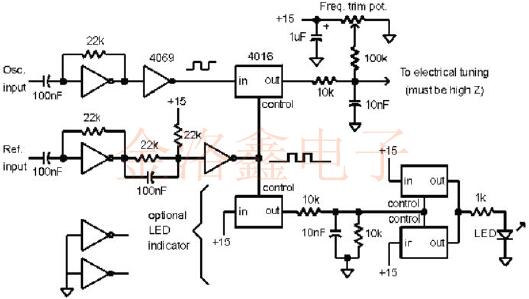 以下電路使用相同的Wenzel晶振技術,僅使用兩個CMOS器件,一個4069十六進制反相器和一個4016或4066模擬開關.頻率微調電位器在不存在基準的情況下控制頻率.該電路還包括一個LED驅動器,用于指示外部參考信號的存在.組分值不是特別關鍵,并且最佳值將取決于應用. 所示電路是具有最高精度振蕩器的一階環路.例如,一個10MHz的烤箱振蕩器調諧靈敏度可能為每伏特1Hz,如果使用15V電源,則相位斜率約為每弧度3伏特.一階環路的帶寬是調諧靈敏度和相位斜率的乘積(1Hz/伏×3伏/弧度=3Hz),該斜率遠低于10K和10nF網絡的滾降頻率.如果振蕩器具有更高的調諧靈敏度,則帶寬將成比例地更高,并且可能需要二階響應來減少外部參考噪聲.盡管可以添加傳統的有損集成運算放大器類型2電路,在沒有基準的情況下,有必要采取其他措施來控制頻率,因為積分器將趨向于漂移至供電軌之一.