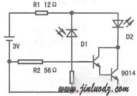 下圖的電路非常簡潔,2只NPN三極管組成復合管用于放大被測的遙控器紅外光信號,D1用扁平紅外線光敏二極管,D2用紅色圓型發(fā)光二極管,Rl為D2限流電阻,R2為遙控器上IC輸出限流電阻,R3與Dl組成分壓電路目的是泄掉Dl的反向穿透電流。如沒有R3,D2將長亮。電阻可使用1/8W的。