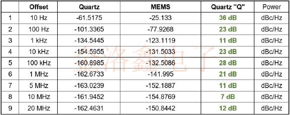 實驗室測量還表明,SMD有源晶振的相位噪聲要比MEMS振蕩器好得多.MEMS振蕩器具有較高的相位噪聲以實現低失調,因為與石英相比,硅諧振器的”Q”或品質因數較差.在10Hz時,石英振蕩器的相位噪聲比MEMS振蕩器好36dB.低失調的相位噪聲對于無線通信至關重要,并可能導致光通信中的某些錯誤.MEMS振蕩器在高失調(12kHz至20MHz)時也具有較高的相位噪聲,因為它們在PLL電路中使用了低QLC振蕩器.