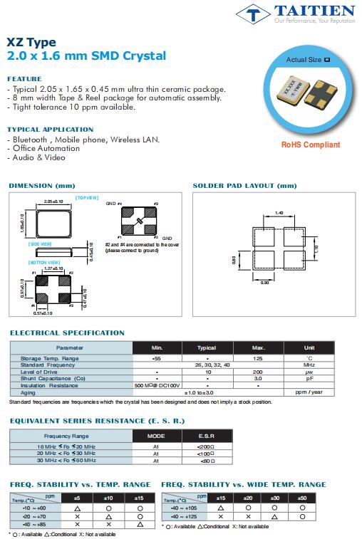 XZBBCDAANF-26.000000 | Taitien晶振 | XZ | 26MHz | -30°C ~ 85°C | 0.081" L x 0.065" W (2.05mm x 1.65mm) |